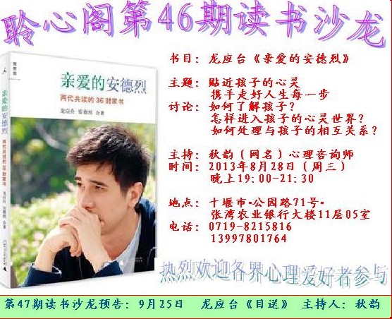第46期读书沙龙将于8月28日(每月最后一个周三)在湖北·十堰·公园路71号·张湾农行大楼11层05室举行。主持人秋韵(网名)老师将带领我们共品龙应台与安德烈合著的《亲爱的安德烈》,一起品味两代人共谱的36封家书,为我们展现如何在文字沟通中亲子都各自成长。