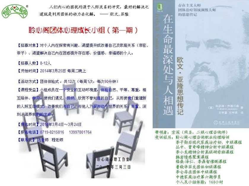 聆心阁团体成长小组(第一期)从2014年3月25日正式开始,小组成员在一个安全的互动环境里,体验自然、平等、尊重,相互陪伴、学习。使每个人遇见、接纳、欣赏不曾知道的自己,从而使大家重建新的人际互动模式,改变与自己、与他人乃至与这个世界的关系,丰富、深刻、滋养我们的生命。